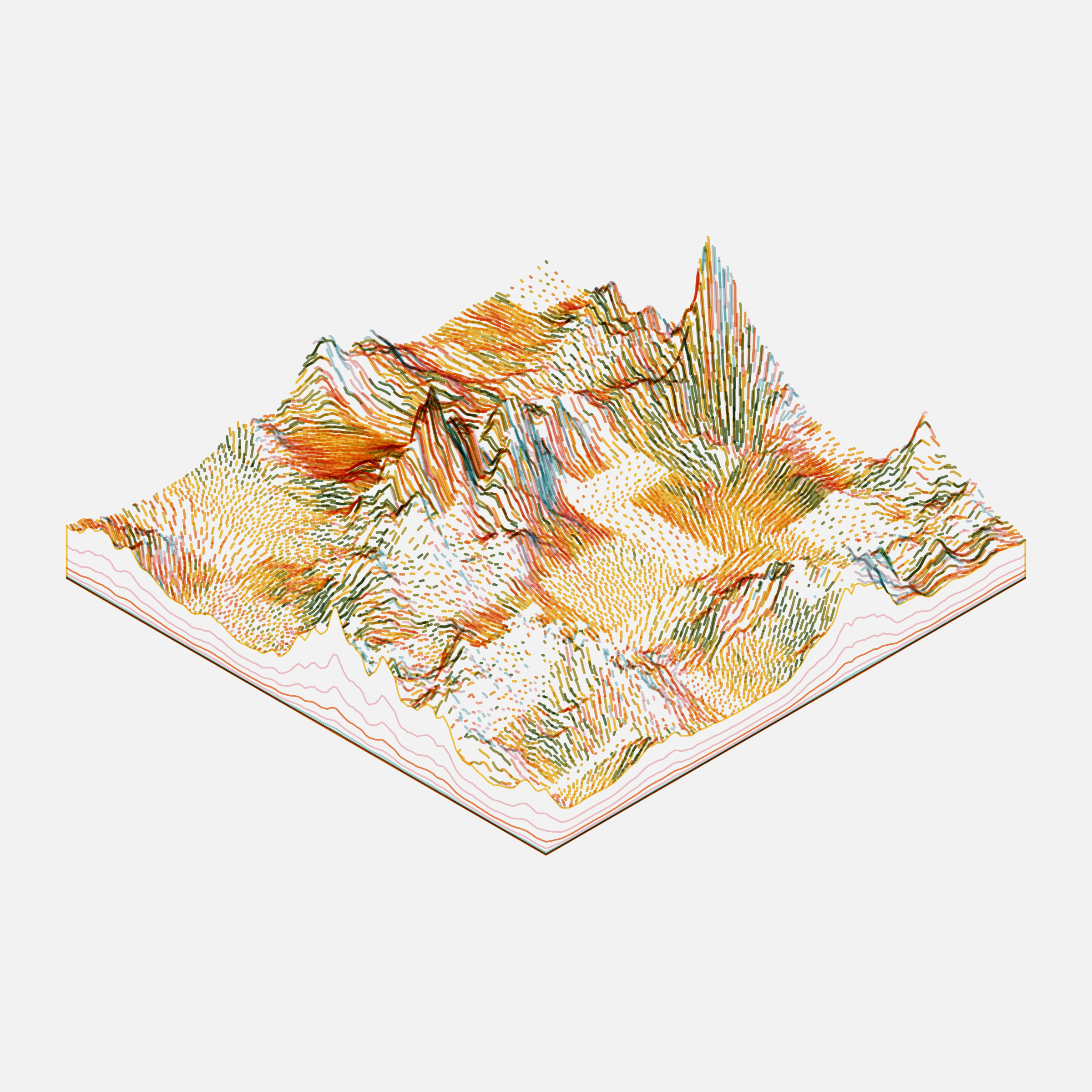 A generative algorithm that draws the impression of a landscape from a multitude of possibilities. The unique seed from each token drives the parametric assortment of lines, colors, and forms into a constructed composition.