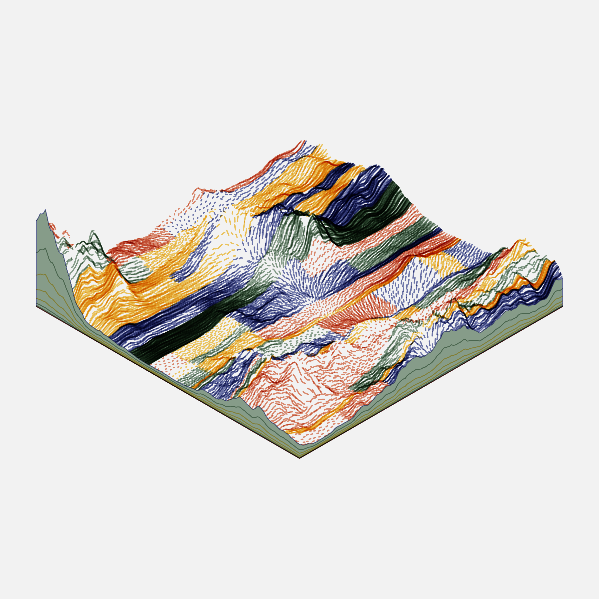 A generative algorithm that draws the impression of a landscape from a multitude of possibilities. The unique seed from each token drives the parametric assortment of lines, colors, and forms into a constructed composition.