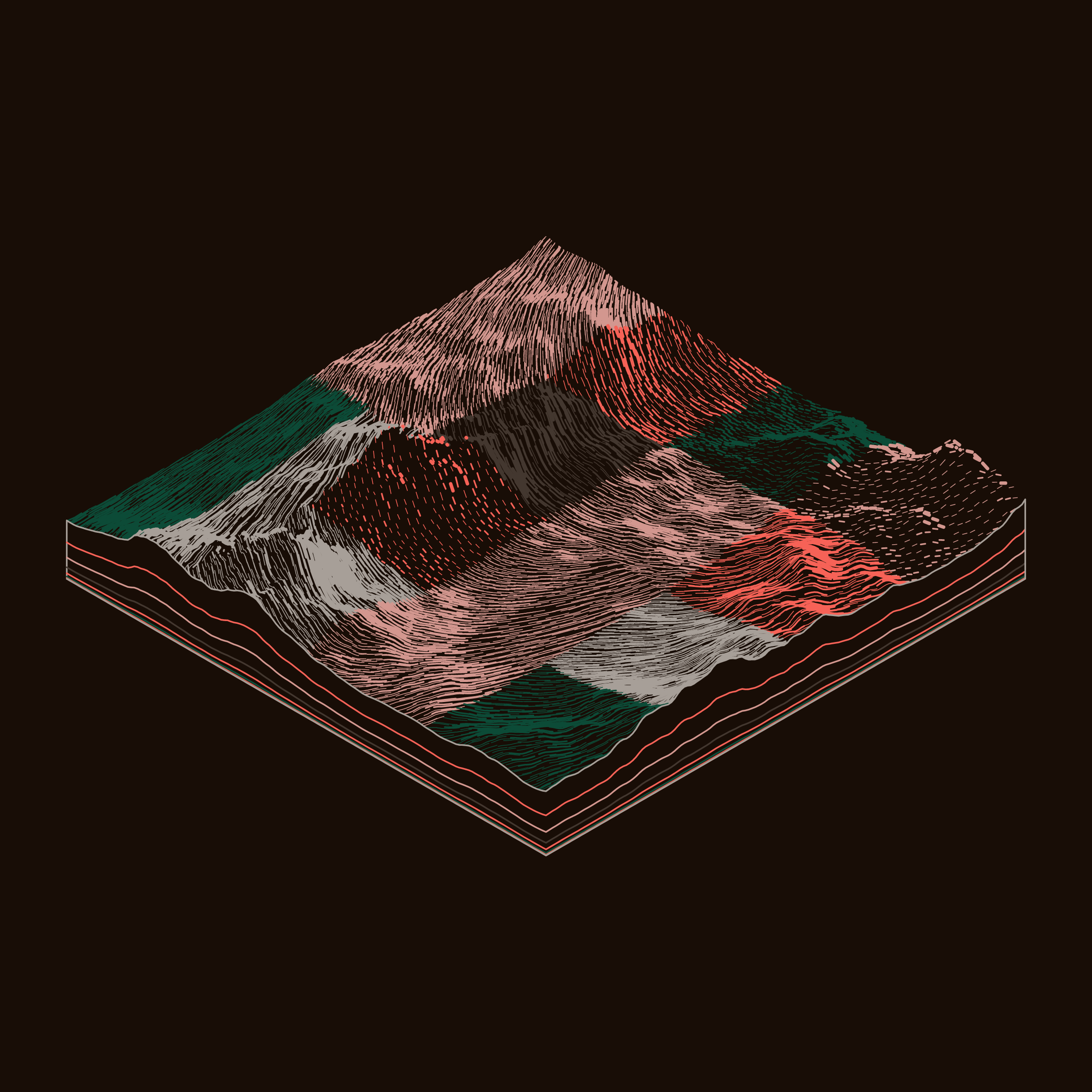 A generative algorithm that draws the impression of a landscape from a multitude of possibilities. The unique seed from each token drives the parametric assortment of lines, colors, and forms into a constructed composition.
