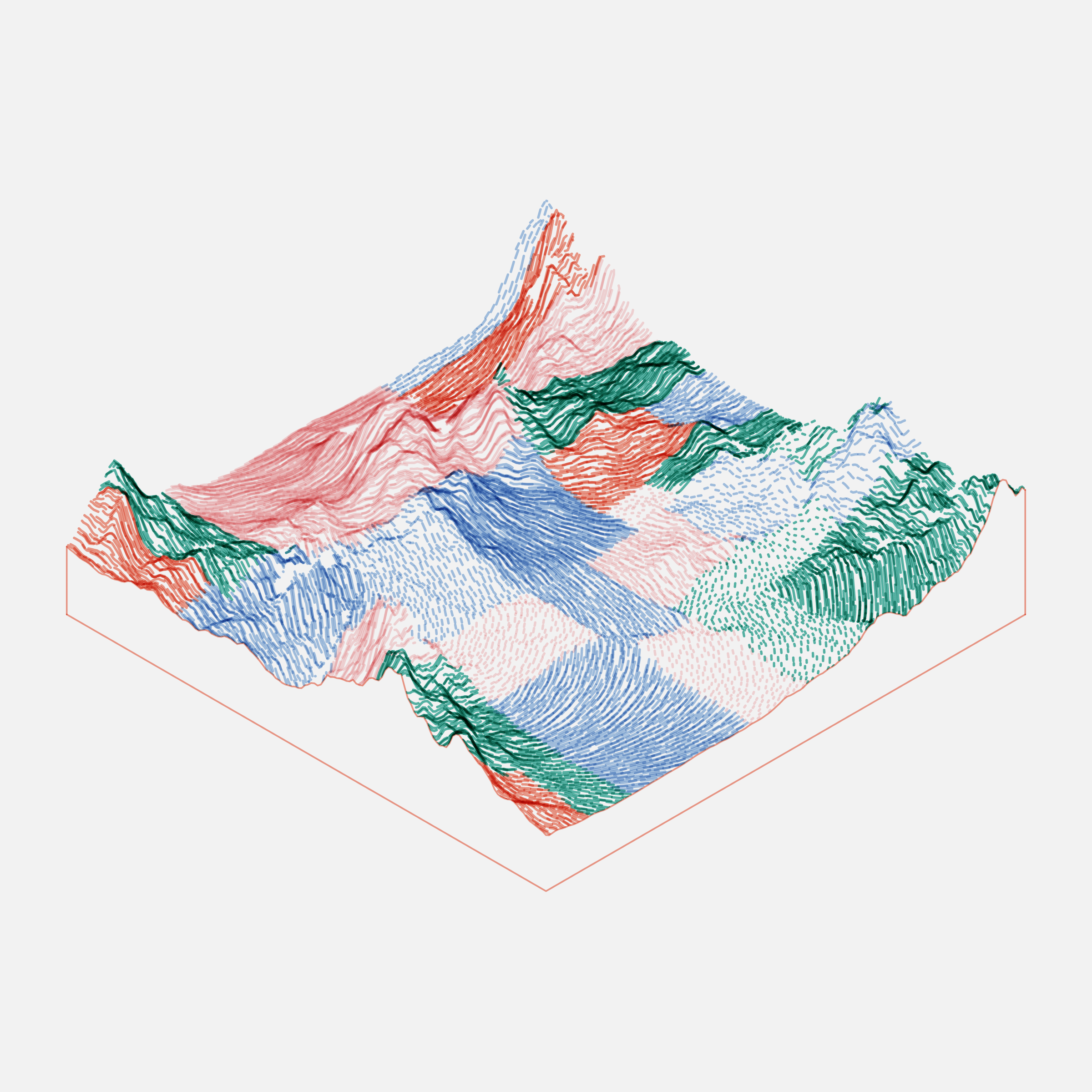 A generative algorithm that draws the impression of a landscape from a multitude of possibilities. The unique seed from each token drives the parametric assortment of lines, colors, and forms into a constructed composition.