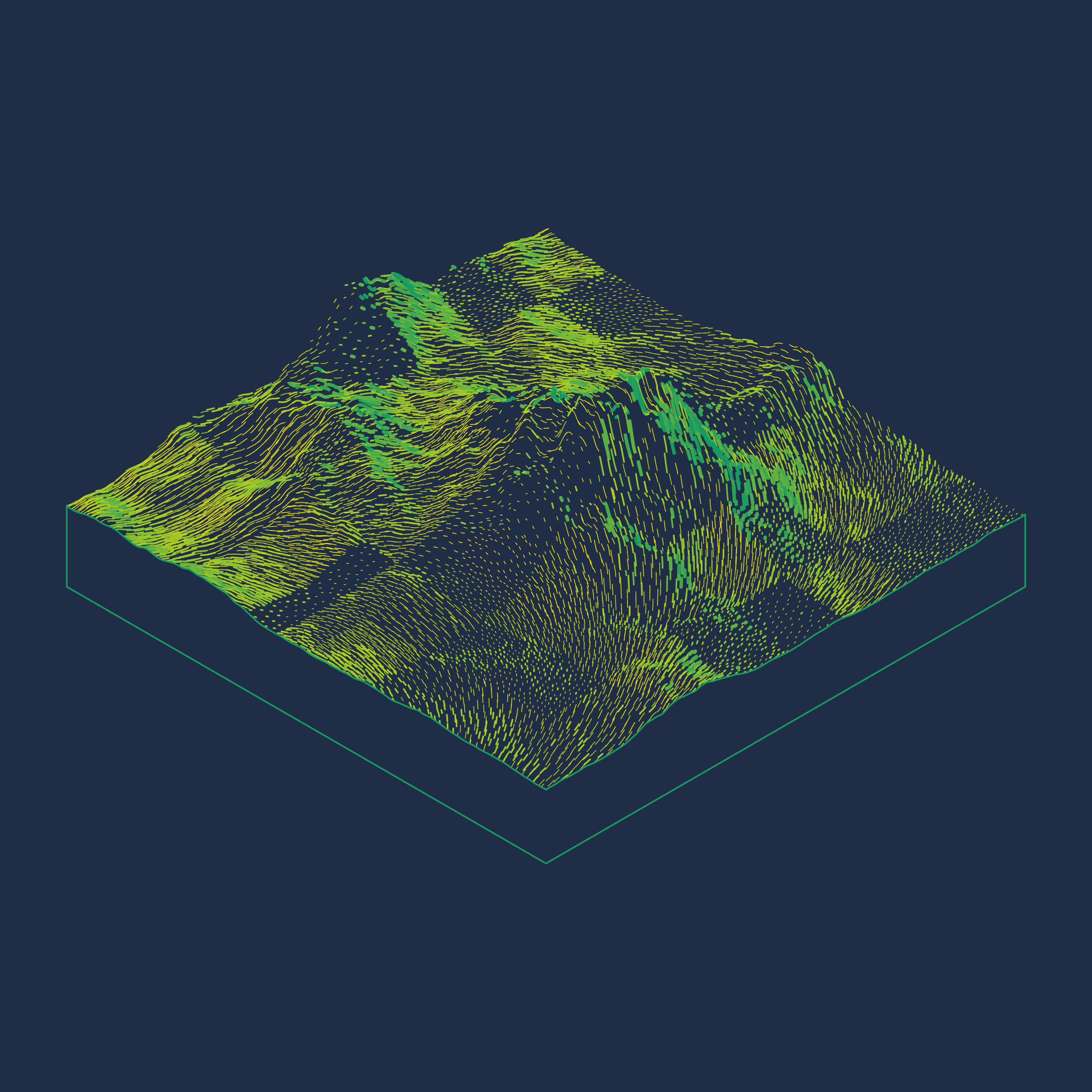 A generative algorithm that draws the impression of a landscape from a multitude of possibilities. The unique seed from each token drives the parametric assortment of lines, colors, and forms into a constructed composition.
