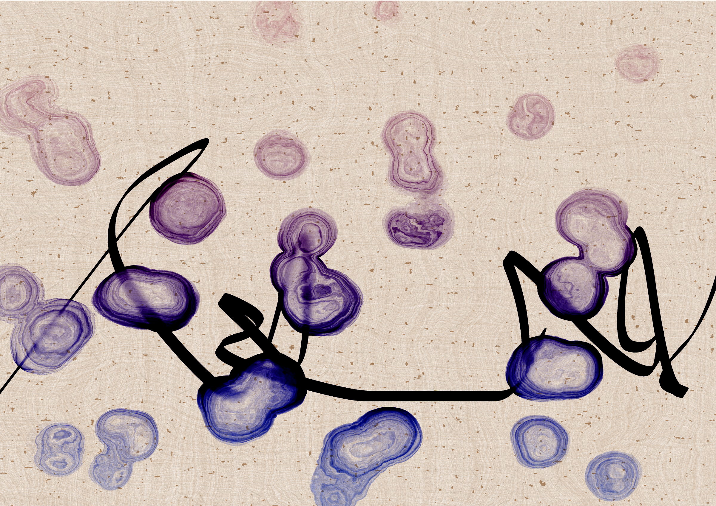 Digital liquid is spilled upon it and takes the ink in directions that are unexpected, uncontrolled, and tell a much more interesting story than the one the line intended.... and often more beautiful.