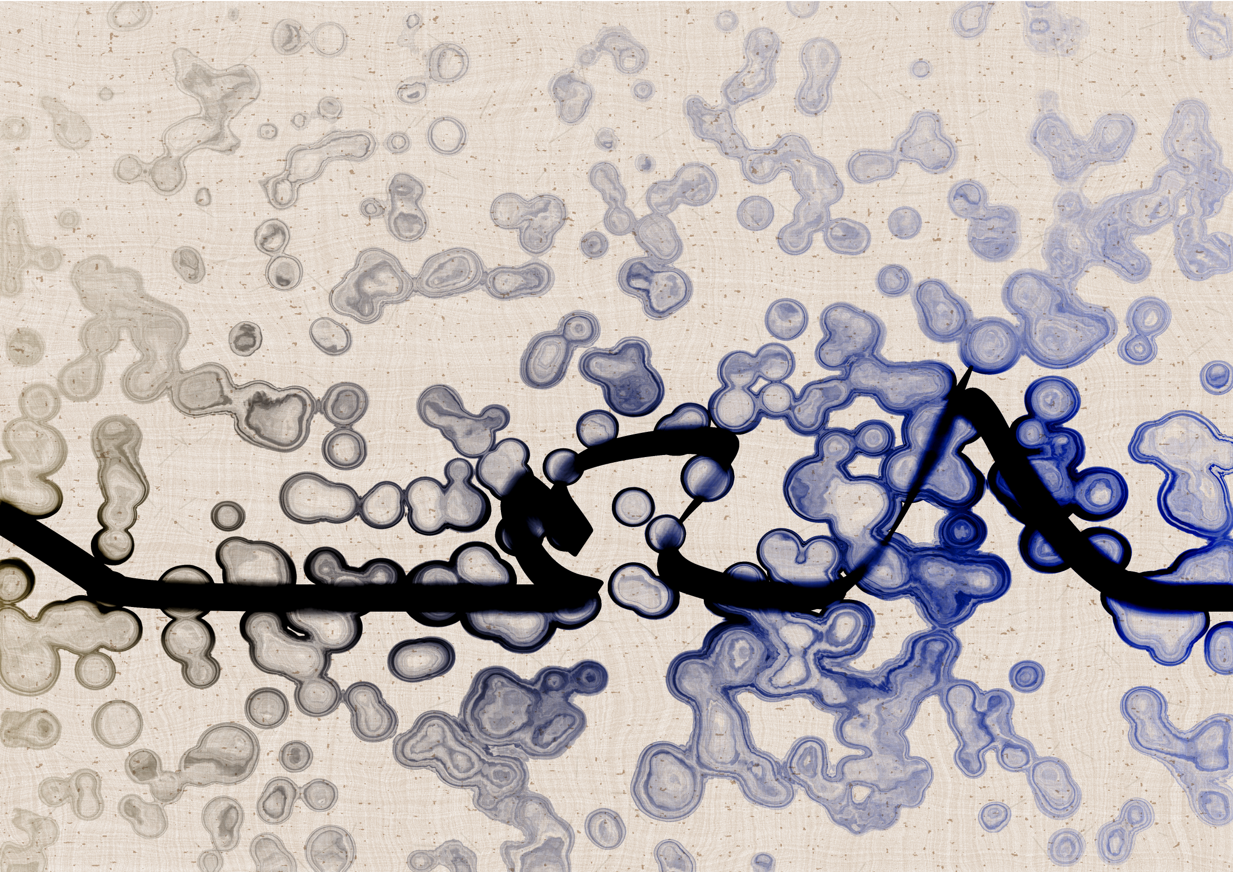 Digital liquid is spilled upon it and takes the ink in directions that are unexpected, uncontrolled, and tell a much more interesting story than the one the line intended.... and often more beautiful.