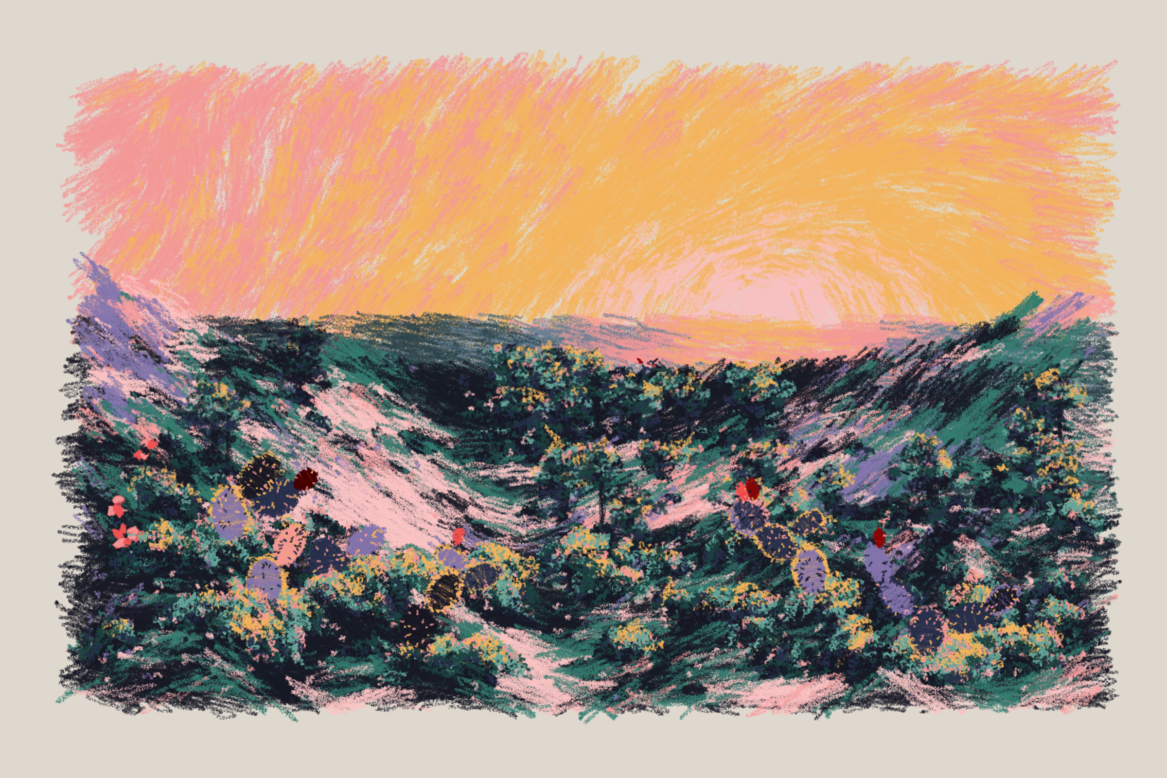 My intention with this work is to capture my memories of those nights, rendered in simulated oil pastels.