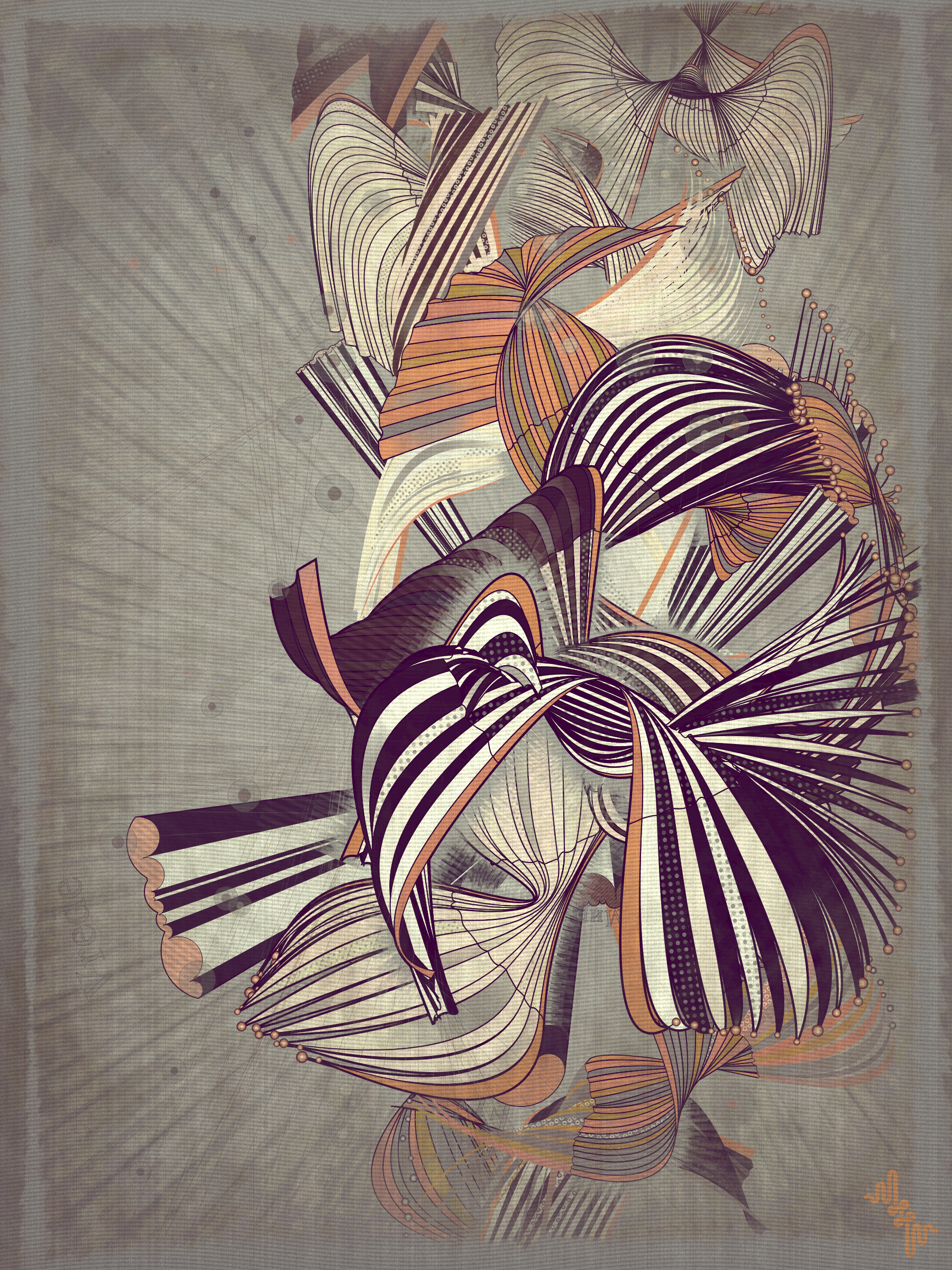 The original ideas evolved by Abstract expressionism and Pop art tell very different stories in the history of post war American art. My approach however is more about just stealing from the visual lexicon of mark-making that characterizes these artistic movements ignoring much of the contextual conversations around them . When I started out building my first primitive for Velum I was picturing in my mind something that looked more like a gestural paint-stroke typical of abstract expressionistic painting. Adding Pop art stylized outlines to the structures however separated them from the background and gave them a floating quality. Liking this effect I quickly forgot about my first idea of making paint strokes to explore the emerging curtain-like elements and found ways to make them dance.