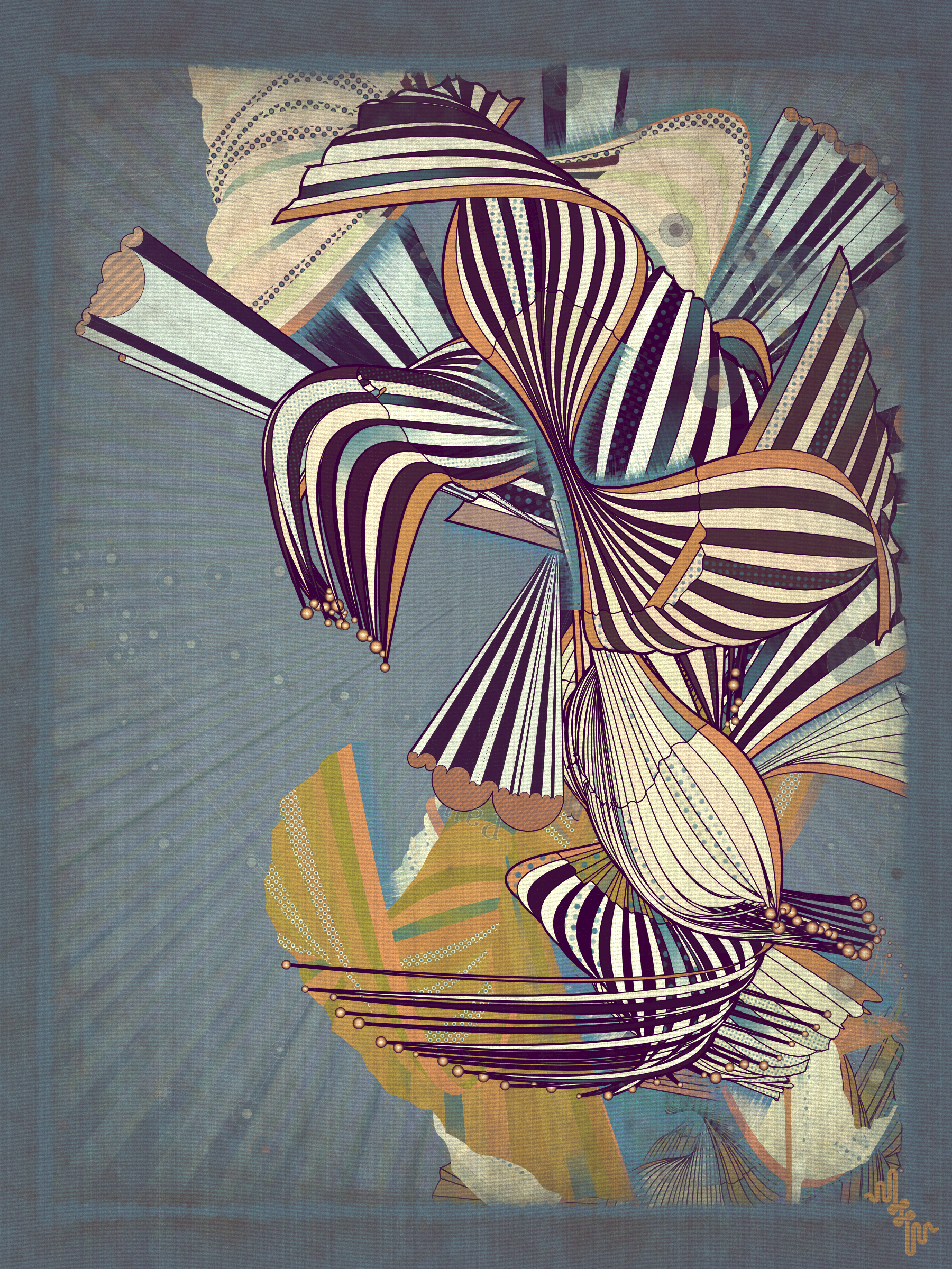 The original ideas evolved by Abstract expressionism and Pop art tell very different stories in the history of post war American art. My approach however is more about just stealing from the visual lexicon of mark-making that characterizes these artistic movements ignoring much of the contextual conversations around them . When I started out building my first primitive for Velum I was picturing in my mind something that looked more like a gestural paint-stroke typical of abstract expressionistic painting. Adding Pop art stylized outlines to the structures however separated them from the background and gave them a floating quality. Liking this effect I quickly forgot about my first idea of making paint strokes to explore the emerging curtain-like elements and found ways to make them dance.