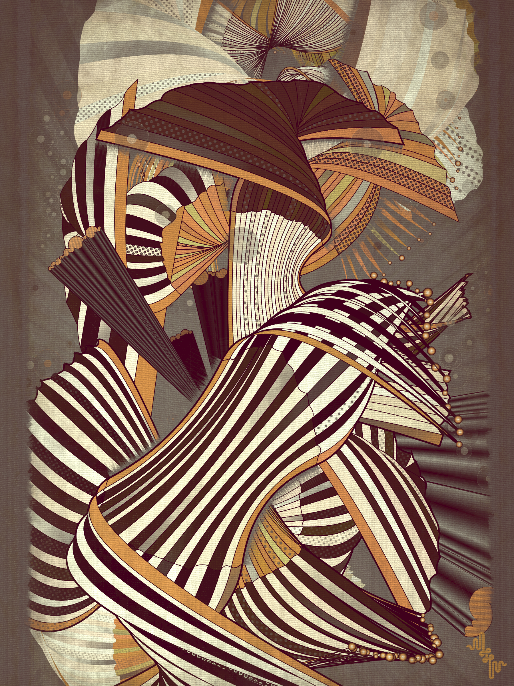 The original ideas evolved by Abstract expressionism and Pop art tell very different stories in the history of post war American art. My approach however is more about just stealing from the visual lexicon of mark-making that characterizes these artistic movements ignoring much of the contextual conversations around them . When I started out building my first primitive for Velum I was picturing in my mind something that looked more like a gestural paint-stroke typical of abstract expressionistic painting. Adding Pop art stylized outlines to the structures however separated them from the background and gave them a floating quality. Liking this effect I quickly forgot about my first idea of making paint strokes to explore the emerging curtain-like elements and found ways to make them dance.