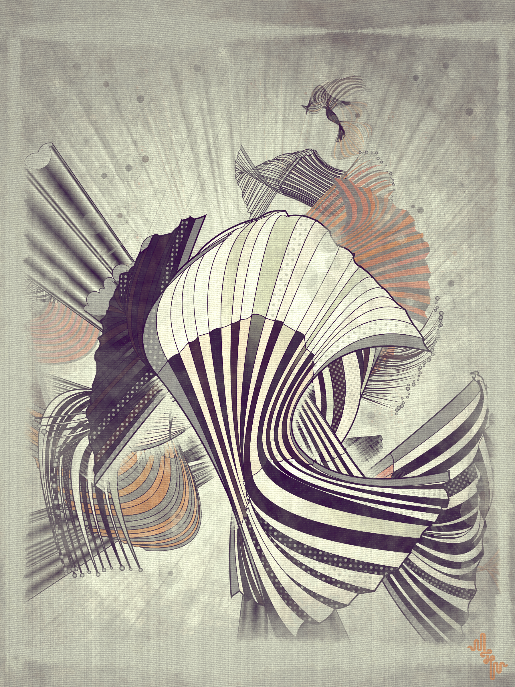 The original ideas evolved by Abstract expressionism and Pop art tell very different stories in the history of post war American art. My approach however is more about just stealing from the visual lexicon of mark-making that characterizes these artistic movements ignoring much of the contextual conversations around them . When I started out building my first primitive for Velum I was picturing in my mind something that looked more like a gestural paint-stroke typical of abstract expressionistic painting. Adding Pop art stylized outlines to the structures however separated them from the background and gave them a floating quality. Liking this effect I quickly forgot about my first idea of making paint strokes to explore the emerging curtain-like elements and found ways to make them dance.